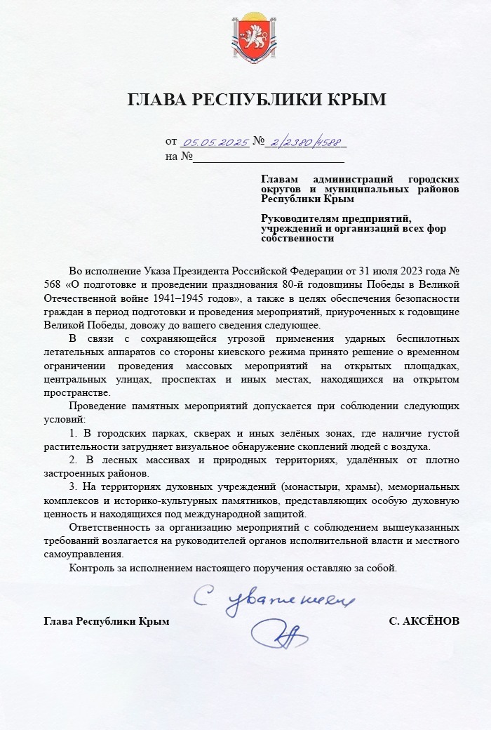 B целях обеспечения безопасности граждан в период подготовки и проведения мероприятий, приуроченных к 80-й годовщине Победы в Великой Отечественной войне, доводим до вашего сведения порядок организации массовых мероприятий в соответствии с поручением Главы Республики Крым.