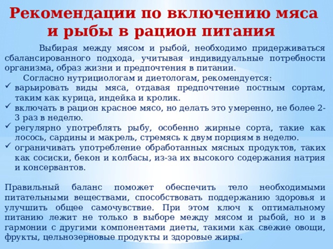 Покупайте продукцию в проверенных местах: Лучше всего приобретать мясо и рыбу в крупных магазинах или специализированных отделах, где соблюдаются условия хранения продуктов (температура, влажность). Избегайте покупки с рук или на стихийных рынках.